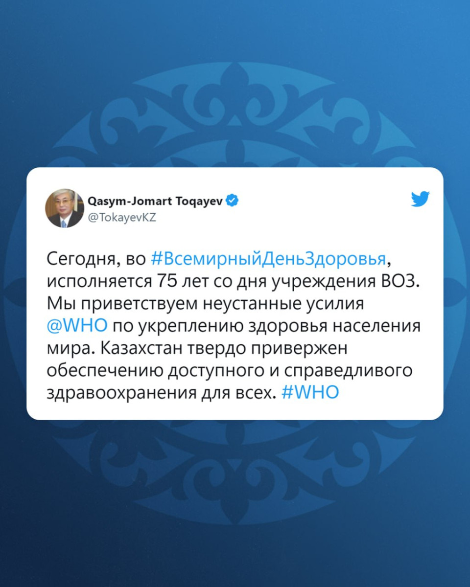 "Сегодня, во Всемирный день здоровья, исполняется 75 лет со дня учреждения Всемирной организации здравоохранения. Мы приветствуем неустанные усилия Организации по укреплению здоровья населения мира. Казахстан твердо привержен обеспечению доступного и справедливого здравоохранения для всех", – написал глава государства в Twitter.