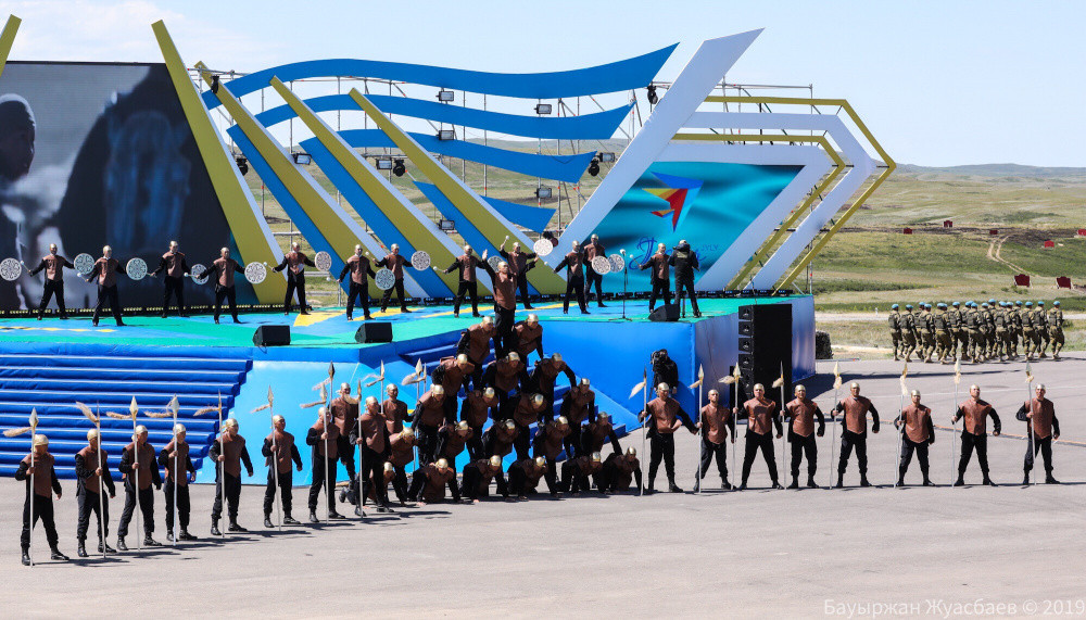 После выступления Главы государства был поднят флаг «Айбын». Также председатель республиканского общественного объединения "Жас Сарбаз", старший лейтенант Мейрбек Мендыгалиев вместе с участниками сбора дал клятву о честном проведении соревнований. В ходе торжественной церемонии открытия военнослужащие воинских частей Сухопутных войск, лётные составы Сил воздушной обороны продемонстрировали участникам боевые возможности вооружения и военной техники – стрельбу из артиллерии, танков, вертолётов армейской авиации и новейших многофункциональных истребителей Су-30СМ.