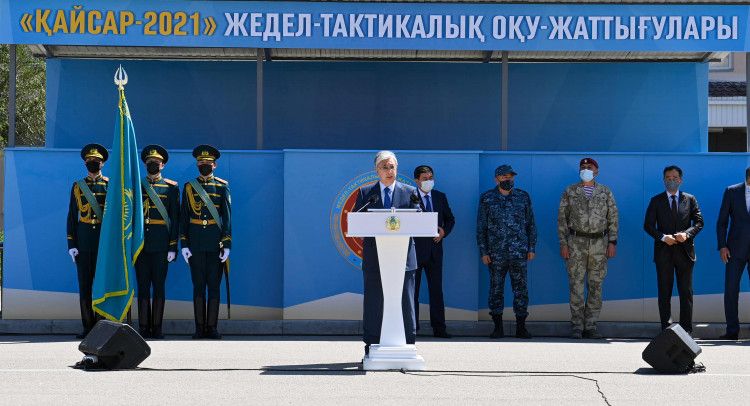 Президент Казахстана – Верховный главнокомандующий Вооруженными силами Касым-Жомарт Токаев посетил оперативно-тактические учения "Кайсар-2021", которые состоялись на базе Центра боевой и методической подготовки подразделений Национальной гвардии МВД Республики Казахстан в Алматинской области, передает