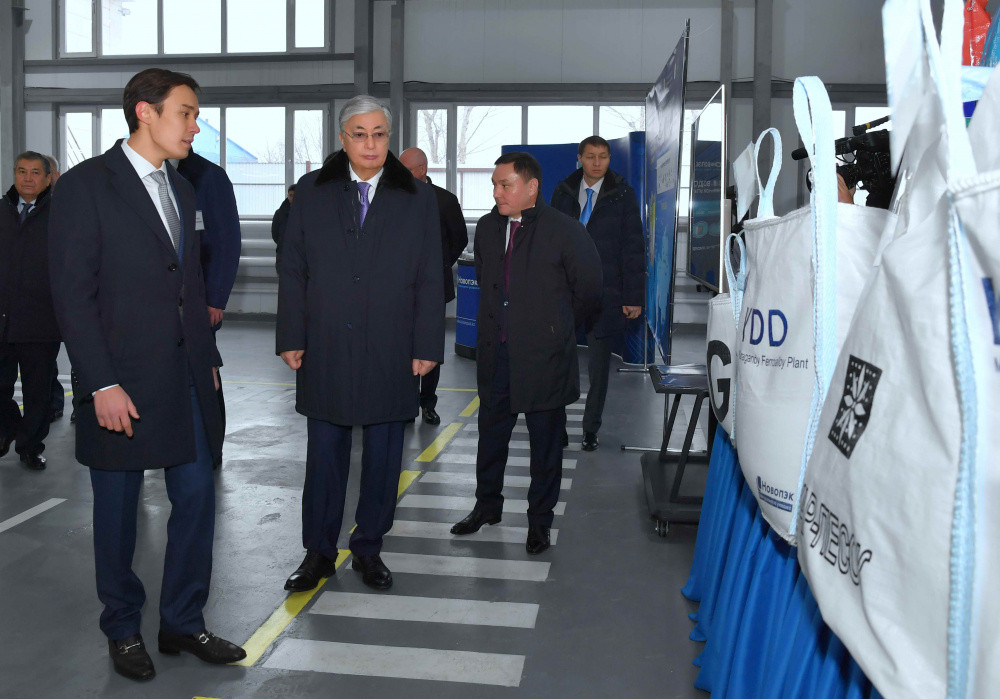 Сообщается, что Токаев ознакомился с технологическим процессом выпуска продукции на предприятии, выпускающем полипропиленовую тару (мешки, мягкие контейнеры и др.).