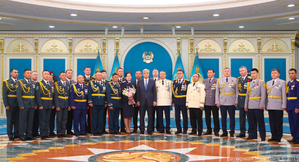 "Уважаемые участники церемонии, символично, что вручение государственных наград проходит накануне знаменательных дат - Дня защитника Отечества и Дня Победы. В эти майские дни мы вспоминаем бессмертный подвиг наших отцов, победивших фашизм. Их безмерный героизм и несгибаемая воля позволили сохранить мир и покой на нашей земле. Сегодня вооружённые силы Казахстана приумножают традиции воинской доблести и боевой славы солдат и офицеров Второй Мировой войны. Армия и силовые структуры надёжно стоят на страже независимости и территориальной целостности нашего государства. Вы с честью выполняете важнейшую миссию - обеспечение безопасности законности и правопорядка в стране. Сегодня мы вручаем награды особо отличившимся соотечественникам, деятельность которых является образцом профессионализма, самоотверженности и верности воинскому долгу", - заявил Касым-Жомарт Токаев на церемонии вручения наград.