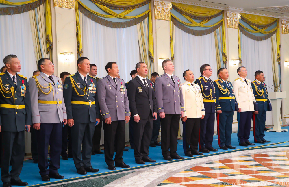 "Уважаемые защитники Отечества, вы достойно выполняете свой воинский долг, сохраняете верность присяге. Вы прилагаете силы, рискуете жизнью ради мира и спокойствия казахстанцев. Каждый из вас является образцом безупречной службы нашей Родины. Каждого из вас можно назвать гордостью Казахстана. Ваши профессионализм, боевая выучка, самоотверженность, готовность к подвигу будут служить примером для подрастающего поколения", - добавил Президент страны.