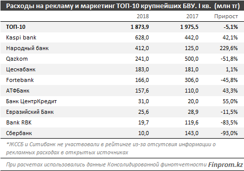 Лидером по расходам на рекламу и маркетинг среди крупнейших БВУ стал Kaspi Bank - 628 млн тг, (годом ранее - 442 млн тг). На втором месте Народный банк, расходы на рекламу которого увеличились более чем в 3 раза - со 125 до 412 млн тг. Замыкает тройку лидеров по вложениям на продвижение банковских услуг Qazkom, находящийся в процессе поглощения Народным - 241 млн тг, что на 51,8% меньше чем годом ранее - 500 млн тг.