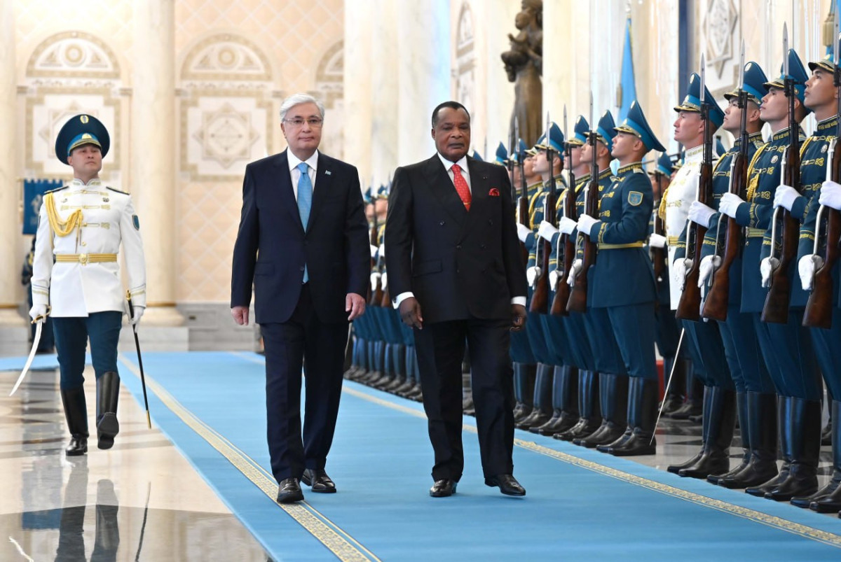 Касым-Жомарт Токаев и Дени Сассу-Нгессо представили друг другу членов официальных делегаций. Начальник роты почетного караула отдал приветственный рапорт, прозвучали государственные гимны двух стран.