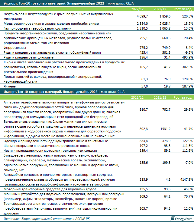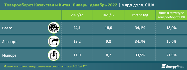 Так, за январь–декабрь 2022 года товарооборот Казахстана с Китаем составил уже 24,1 миллиарда долларов США — сразу на 34,1 процента больше, чем годом ранее, передаёт BaigeNews.kz со ссылкой на Energyprom.kz.