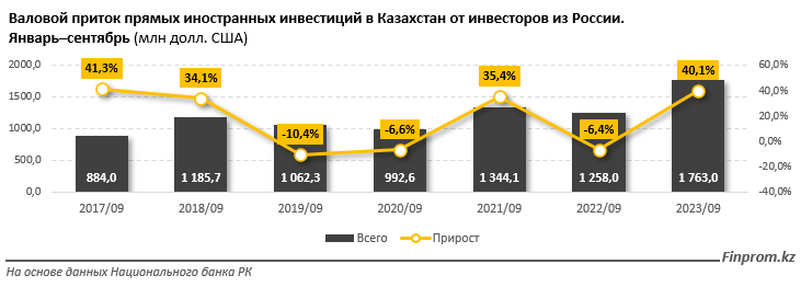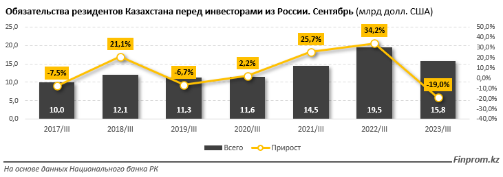 Для сравнения: на 1 октября 2022-го объём обязательств резидентов Казахстана перед инвесторами из России достигал 19,5 млрд долл. США - на заметные 34,2% больше, чем годом ранее.