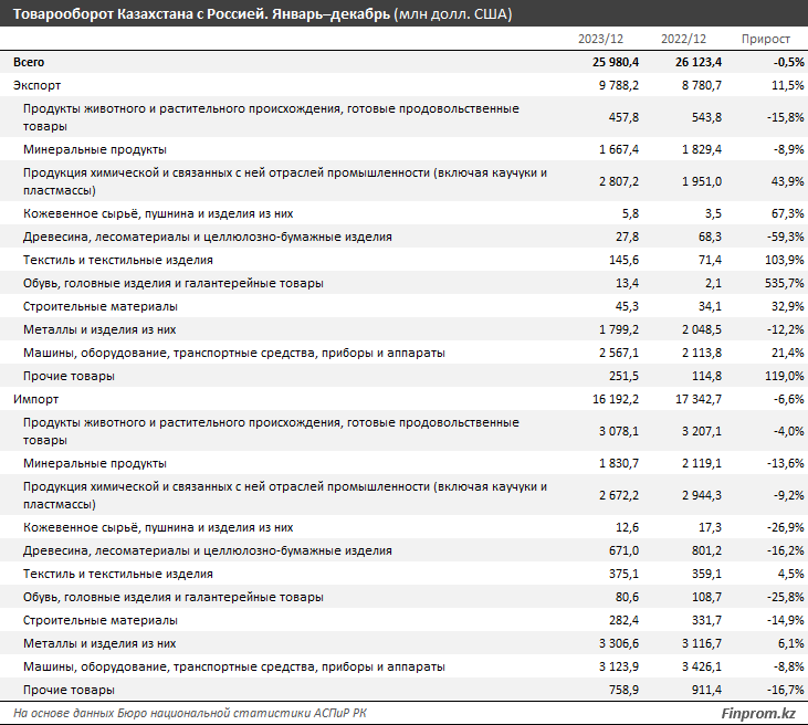 По итогам января–декабря 2023 года товарооборот Казахстана с Россией составил 26 млрд долл. США - на 0,5% меньше, чем годом ранее.
