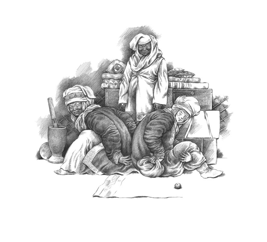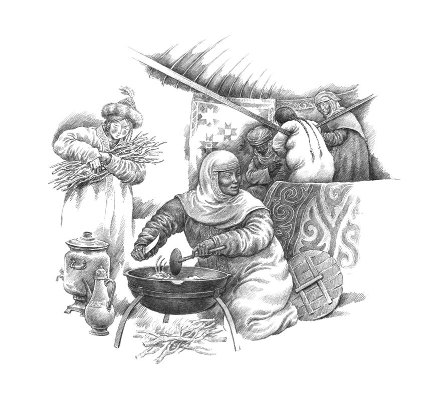 "Пока прибывшие разгружали своих навьюченных верблюдов и разбирались со сложенным скарбом, жители близстоящих домов шли к ним, неся напитки и горячую пищу. Накормив прибывших, добровольные помощники принимались помогать им. Развязывали многочисленные тюки, разбирали связанные по частям принадлежности юрты и устанавливали её", – повествует автор.