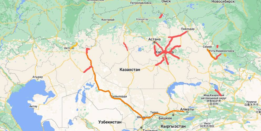Больше всего трасс перекрыто в Карагандинской области – 9 участков (1022 км). Далее следует область Абай – 6 участков (733 км). На третьей стройчке в этом своеобразной рейтинге Актюбинская и Павлодарская области – по 5 участков протяженностью 792 и 539 км соответственно.