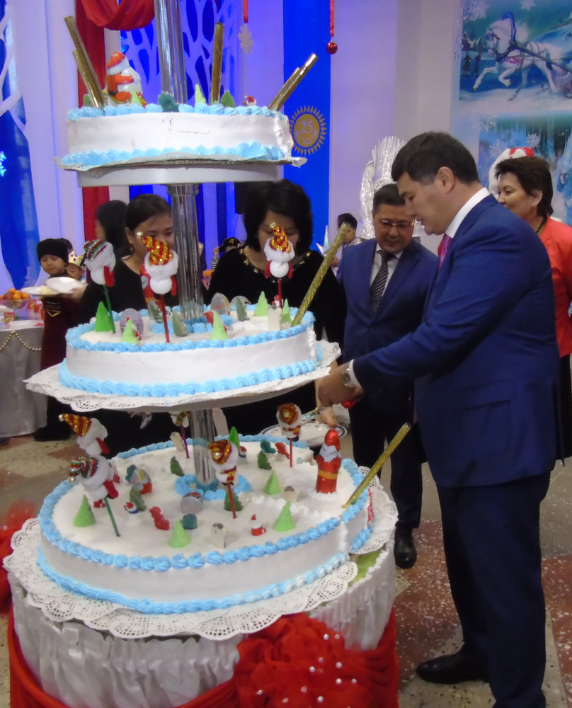 Украшением праздника стал трехэтажный торт, подаренный детворе акимом города Нурлыбеком Налибаевым.