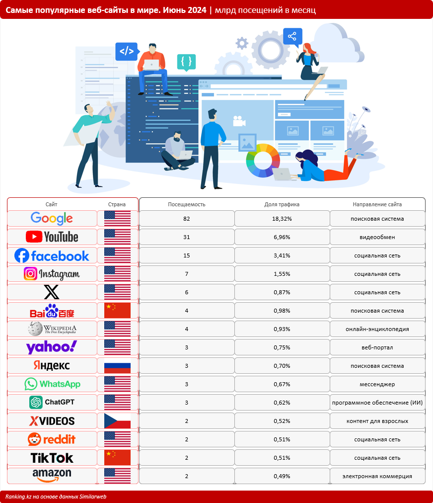 По итогам июня текущего года на долю одного лишь сайта google.com приходится 18,32% мирового веб-трафика, а его посещаемость в месяц достигает 82 миллиардов пользователей, передаёт BaigeNews.kz со ссылкой ranking.kz.