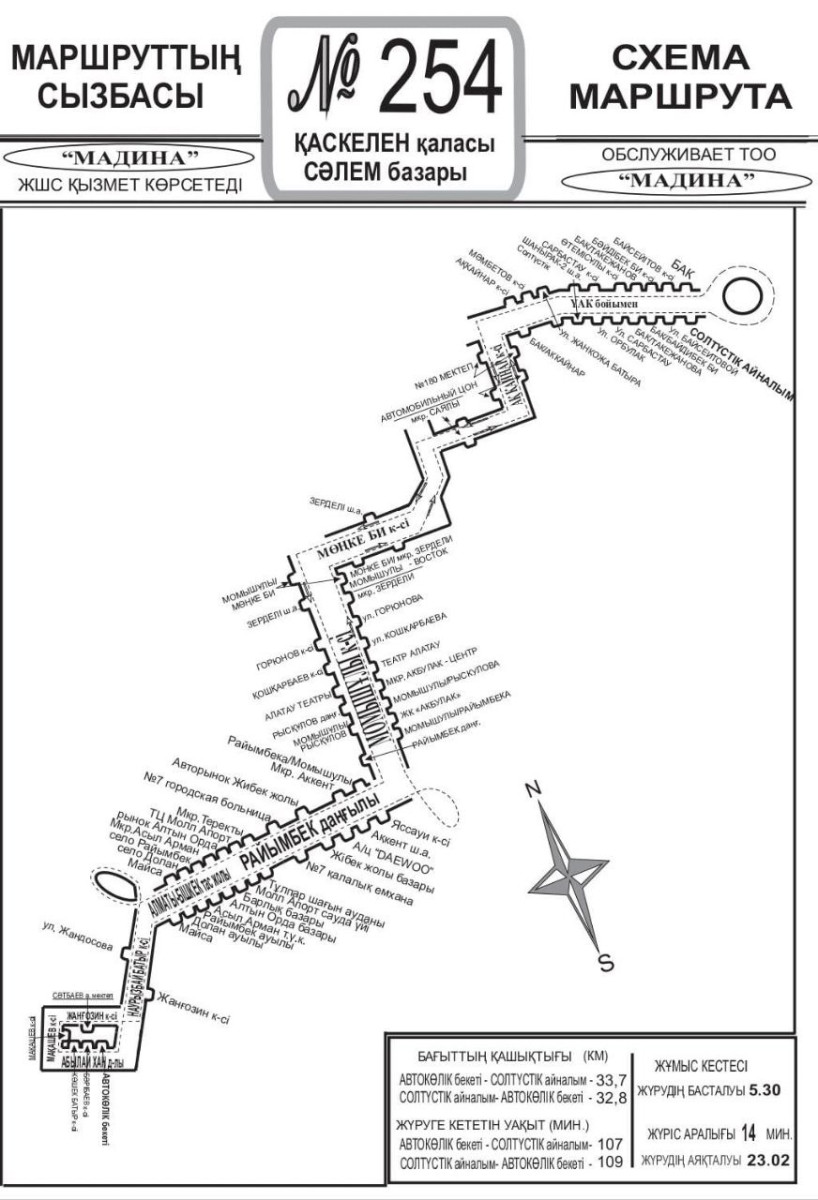 Маршрут №254 будет следовать от города Каскелен по проспекту Абылай хана, трассе Алматы-Бишкек, проспекту Райымбека, улицам Момышулы, Монке би, Ак-Кайнар, вдоль БАКа. В будни перевозчик будет выпускать 16 автобусов, по субботам 12 машин, в воскресенье 10. Интервал движения - 14 минут.
