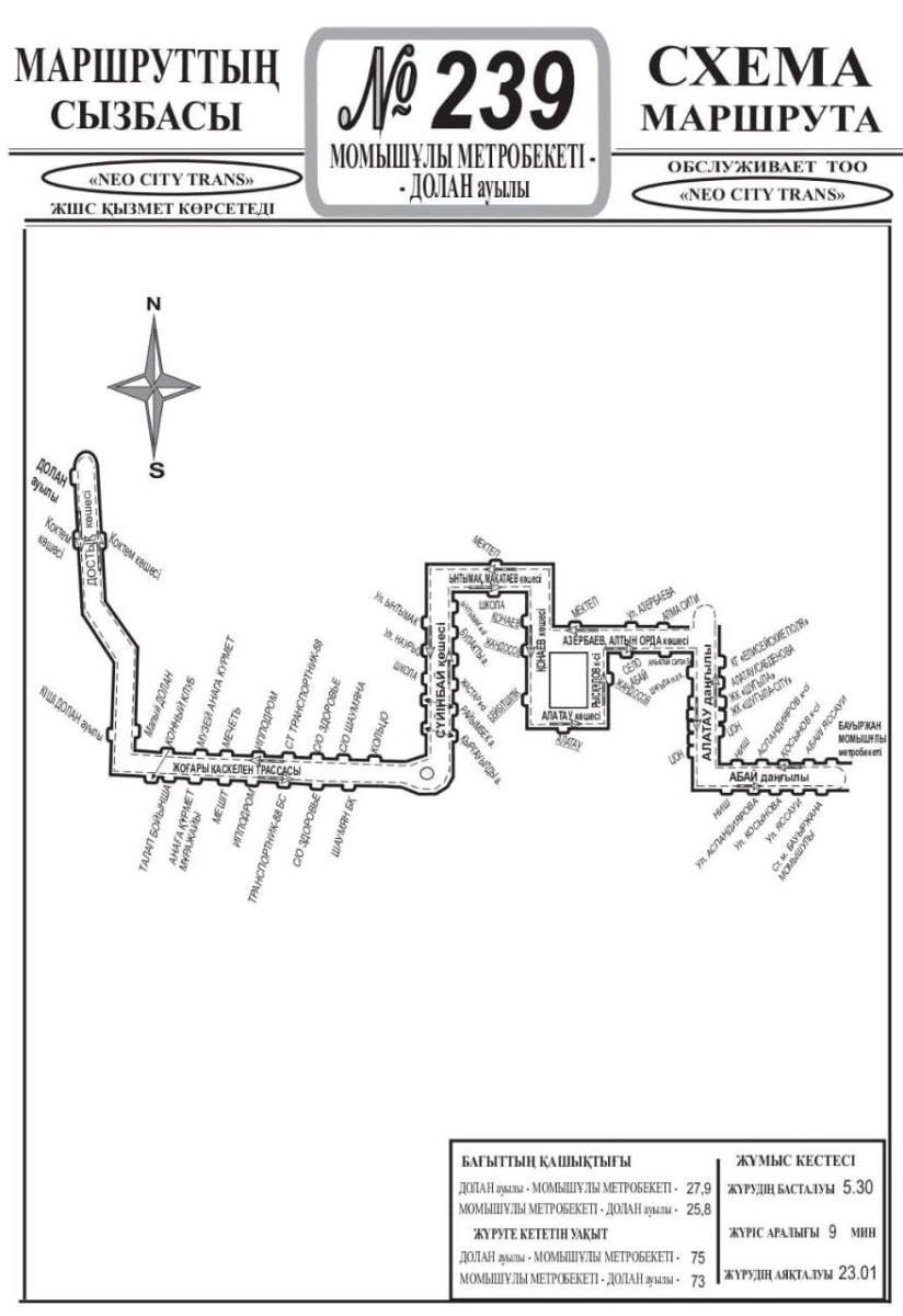 Маршрут №239 будет начинать движение от станции метро "Бауыржан Момышулы" и следовать до конечной в посёлке Долан по следующей схеме: пр. Абая – пр. Алатау – ул. Алтын Орда – ул. Азербаева – ул. Конаева – ул. Ынтымак – ул. Суюнбая – Верхняя Каскеленская трасса – пос. Малый Долан – пос. Долан. В будни на линии будут 18 автобусов, в выходные - 15 автобусов. Интервал движение - девять минут.