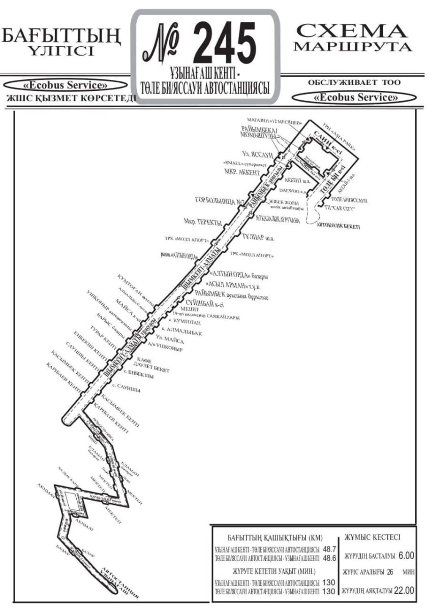 Новый маршрут №245 будет курсировать от села Узынагаш до автостанции на пересечении Толе би/Яссауи. В будни будут ездить 25 автобусов, в выходные - 14, интервал - 26 минут.