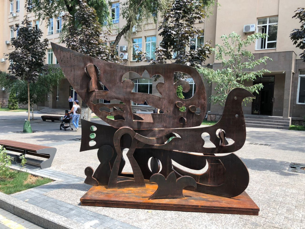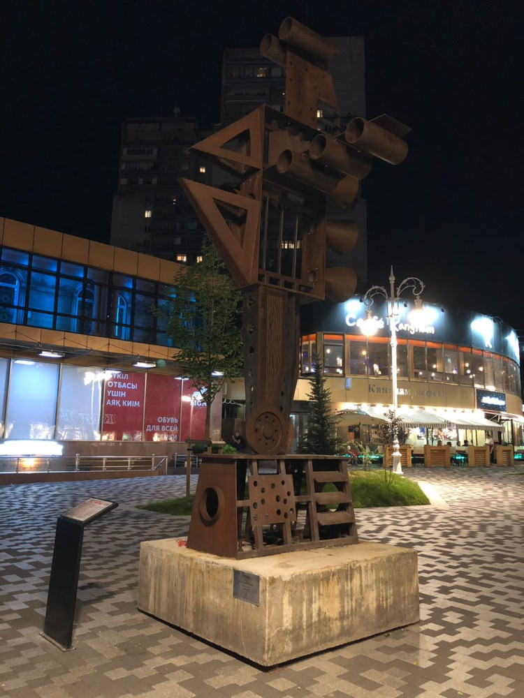 Второй арт-объект можно увидеть на пересечении улиц Панфилова и Казыбек Би. Автор скульптуры назвал её "Дом-Птица".