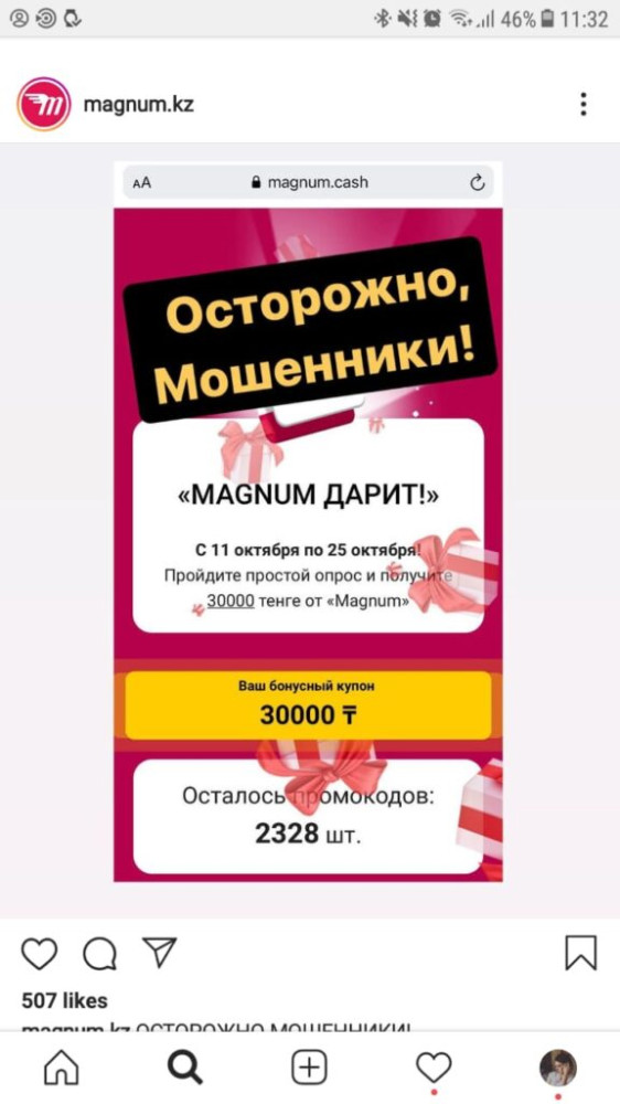 "В рассылках сообщается о раздаче при прохождении анонимного опроса купонов на определенную денежную сумму. Доводим до вашего сведения, что все указанные сообщения являются недостоверными и не имеют никакого отношения к деятельности ТОО "Magnum Cash&Carry", – сказано на официальной странице компании в Instagram.