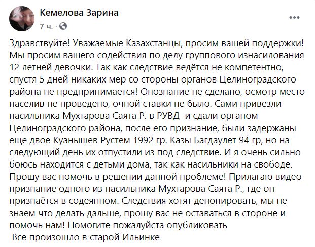 "Спустя пять дней никаких мер со стороны органов Целиноградского района не предпринимается. Опознание не сделано, осмотр места насилия не произведен, очной ставки не было. Сами привезли насильника и сдали органам. После его признания были задержаны еще двое. Но на следующий день их отпустили. Я очень боюсь находиться с детьми дома, так как насильники на свободе", -