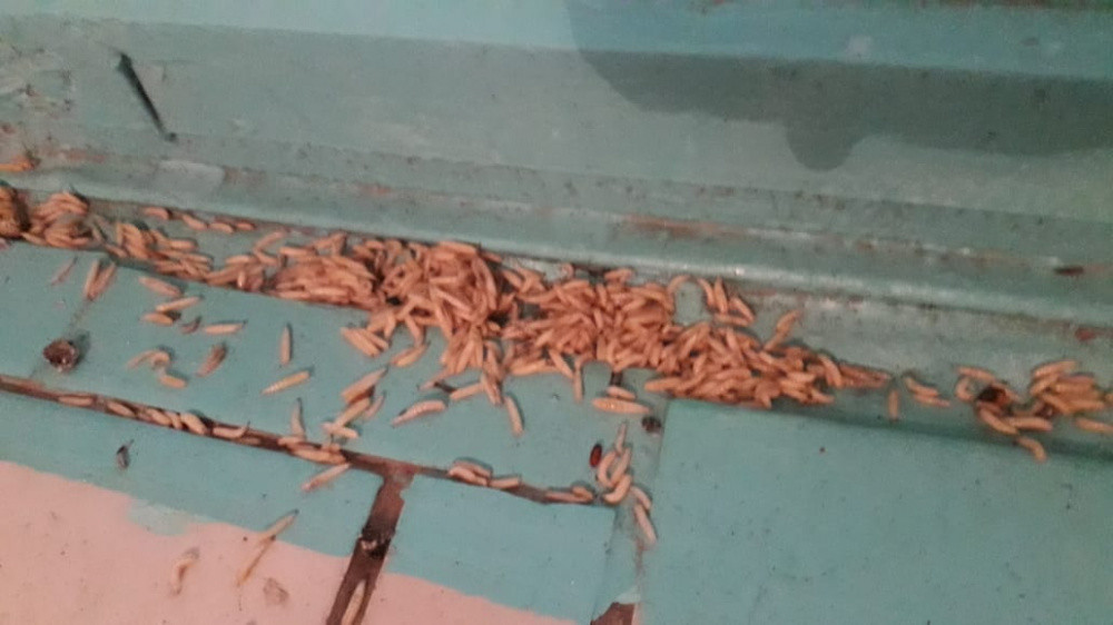 “Муж увидел червей в субботу в обед. Они сыпались с чердака. Начал заливать их кипятком, они сверху сыпались ему на голову. Через два часа приехали домой, а вся площадка была уже засыпана червями. Позвонили в службу 112, 109, реакции никакой не было, сказали, ждите понедельника. Ходили по площадке, а они под ногами хрустели. Видимо, там дохнут голуби в большом количестве, потому что и с балкона постоянно сыпется мусор. Запах в квартиры идет из отдушины в ванной и кухни”, - рассказала жительница дома Юлия Цыпина.