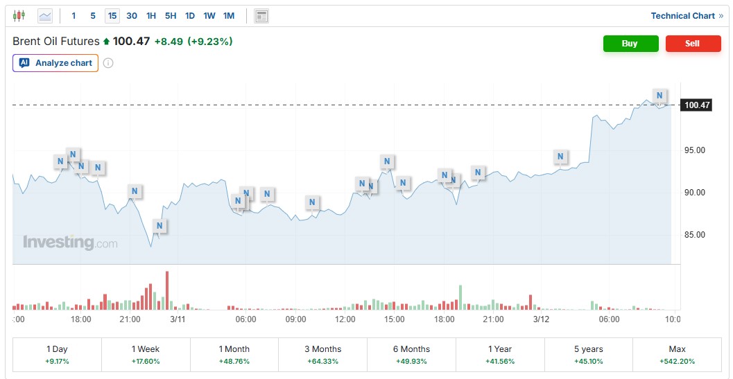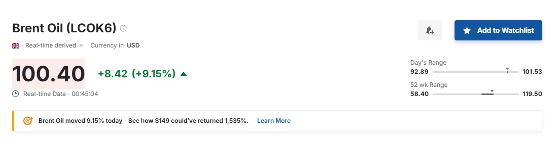 По данным торговых площадок, стоимость фьючерсов на нефть Brent достигла примерно 100,40 доллара за баррель, прибавив около 9% за день. В течение суток цена поднималась до 101,5 доллара.