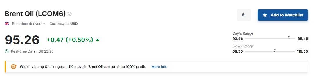 По последним данным, стоимость нефти марки Brent составляет примерно 95 долларов за баррель.