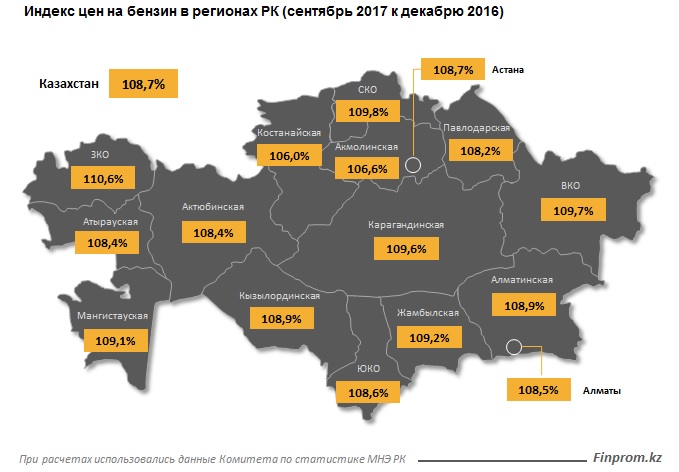 В этом году наиболее резко цены на бензин увеличиваются в нефтяной ЗКО - в сентябре по сравнению с декабрем 2016 году автомобильное топливо подорожало на 10,6%, годом ранее прирост цен в регионе составлял всего 0,9%.