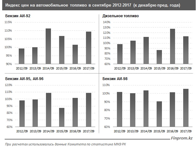 За девять месяцев 2017 года бензин в Казахстане подорожал на 8,7%, сообщает finprom.kz.