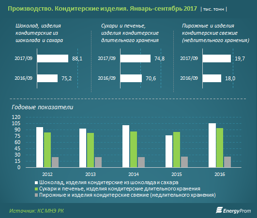 Доля казахстанских производителей на рынке в сравнении с прошлым годом выросла: для шоколада и прочих конфет - до 58,6% по итогам 8 месяцев, для печенья и прочих сдобных изделий с долгим сроком хранения - до 64,7%.