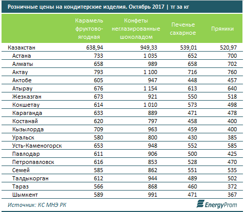 По итогам октября фруктово-ягодная карамель стоила в среднем по РК 638,9 тг за кг, на 12,5% дороже, чем годом ранее, конфеты (не глазированные шоколадом) - 949,3 тг за кг, +10,7% за год. Печенье подорожало на 8,9% за год, до 539 тг за кг, пряники - на 7,9%, до 521 тг за кг.