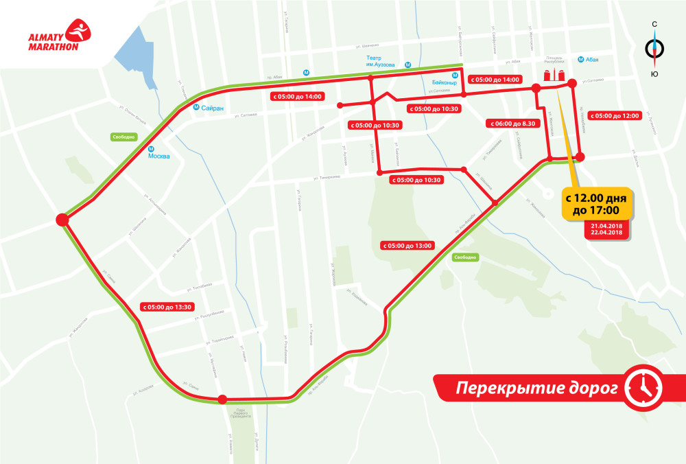 Таблица по перекрытию дорог на Алматы Марафон 2018 (21-22.04.2018):