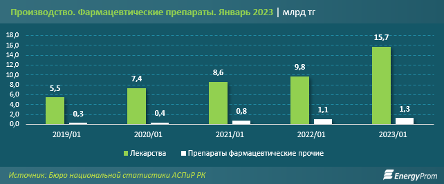 Производство фармацевтических препаратов за первый месяц текущего года достигло 17 миллиардов тенге из которых 15,7 миллиарда тенге пришлось на лекарства, 1,3 миллиарда тенге - на прочие фармацевтические препараты. Выпуск лекарств по сравнению с январём 2022 года вырос на 61,3 процента в деньгах (и на 57,3 процента в реальном выражении), прочих фармацевтических препаратов — на 22,9 процента (впрочем, тут реальный рост составил всего 0,1 процента).