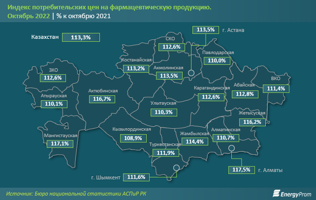 По итогам октября цены на фармацевтическую продукцию в стране выросли на 13,3 процента за год, передаёт BaigeNews.kz со ссылкой на Еnergyprom.kz.