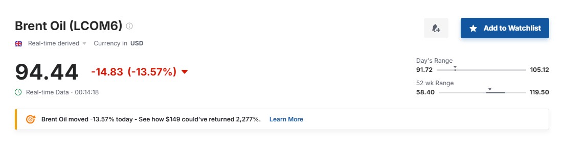 Согласно данным аналитических платформ, общее падение цен на сырую нефть на мировых рынках достигло 14%, а стоимость барреля приблизилась к отметке 96 долларов. Существенно подешевели и нефтепродукты: мазут снизился примерно на 17%, бензин — почти на 10% за сутки.