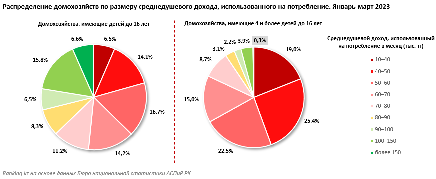 Тот факт, что сумма в 100 тысяч тенге очень ощутима для семейного бюджета многих семей, подтверждают и следующие цифры: по данным Бюро национальной статистики АСПиР РК, 77,6 процента семей с детьми до 16 лет в Казахстане имеют среднедушевые доходы, используемые на потребление, до 100 тысяч тенге. Семей с детьми, кто могут себе позволить тратить в месяц от 100 тысяч до 150 тысяч тенге всего 15,8 процента, более 150 тысяч тенге – 6,6 процента.