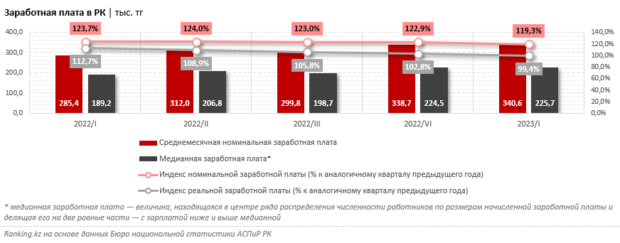 Среднемесячная номинальная зарплата в первом квартале 2023-го была равна 340,6 тысячи тенге, медианная (то есть зарплата "среднего казахстанца") — 225,7 тысячи тенге. При этом расчётный уровень расходов, использованных на потребление, был равен 80,2 тысячи тенге на одного человека в месяц. Из них на непродовольственные товары уходило 19,6 тысячи тенге. Таким образом, затраты родителей на минимальный набор одежды, обуви и канцелярских принадлежностей превышают средние месячные расходы на непродовольственные товары в четыре раза.