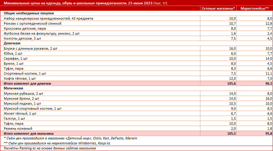 В итоге общая стоимость покупок, по данным на 25 июня, была в пределах 100 тысяч тенге. Различия в затратах на сборы для мальчиков и девочек оказались незначительными, зато разница в закупе в магазинах и на маркетплейсах составила около 10 тысяч тенге. Покупать школьную форму и принадлежности в интернете оказалось дешевле — 95,8 тысячи тенге на мальчика и 96,3 тысячи тенге на девочку, тогда как в сетевых магазинах стоимость минимального школьного набора для мальчиков составляла 105,5 тысячи тенге, для девочек — 105,6 тысячи тенге.