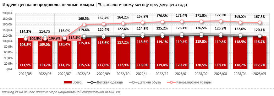Согласно индексам потребительских цен, детская одежда, обувь и канцелярские товары дорожают больше, чем в среднем непродовольственные товары. Так, если в мае этого года инфляционный показатель для этой укрупнённой группы составил 117,2 процента, то для детской одежды он достигал 118,7 процента, для обуви — 120,1 процента, для канцтоваров — 167,5 процента.