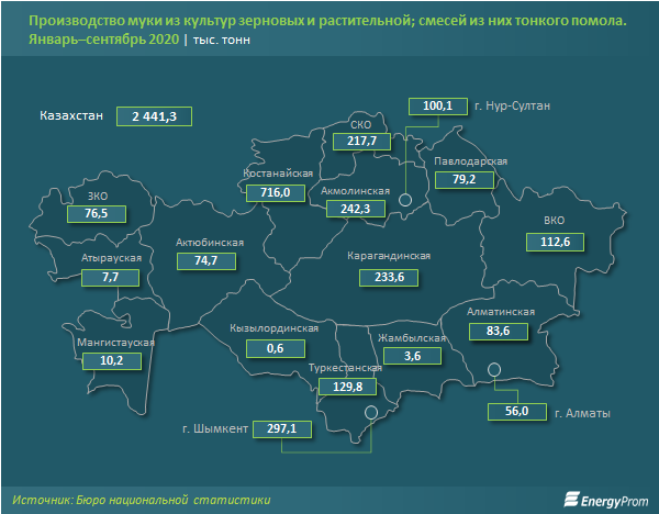 В разрезе регионов наибольший объем производства традиционно пришелся на Костанайскую область: 716 тысяч тонн – на 8,4 процента больше, чем в прошлом году. В тройку лидеров также вошли Шымкент (297,1 тысячи тонн, минус 13,6 процента) и Акмолинская область (242,3 тысячи тонн, минус 4,5 процента).
