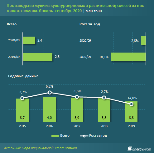 За январь-сентябрь 2020 года мукомолы страны произвели 2,4 миллиона тонн муки – на 2,3 процента меньше, чем годом ранее.