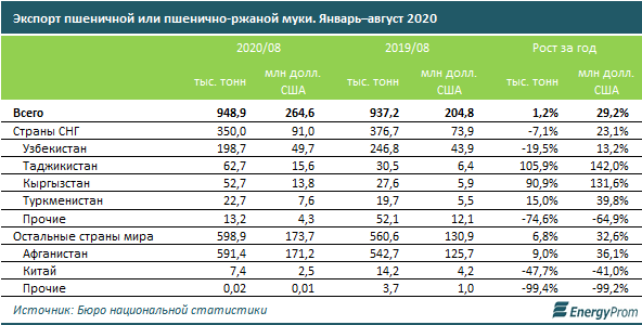 В денежном выражении экспорт пшеничной и пшенично-ржаной муки достиг 264,6 миллиона долларов, увеличившись сразу на 29,2 процента за год. В страны СНГ отправили 350 тысяч тонн муки на 91 миллион долларов. Основной импортер среди стран СНГ – Узбекистан.