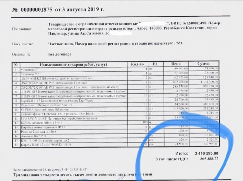 "В июле 2019 года без объявления конкурса или запроса ценовых предложений был заключен договор на оказание работ по устройству (монтажу) системы видеонаблюдения на сумму, ни много ни мало, 7,5 миллиона тенге, - написал автор. - К договору прилагалась техническая спецификация с перечнем закупки. Мы решили проверить, не завышена ли сумма".