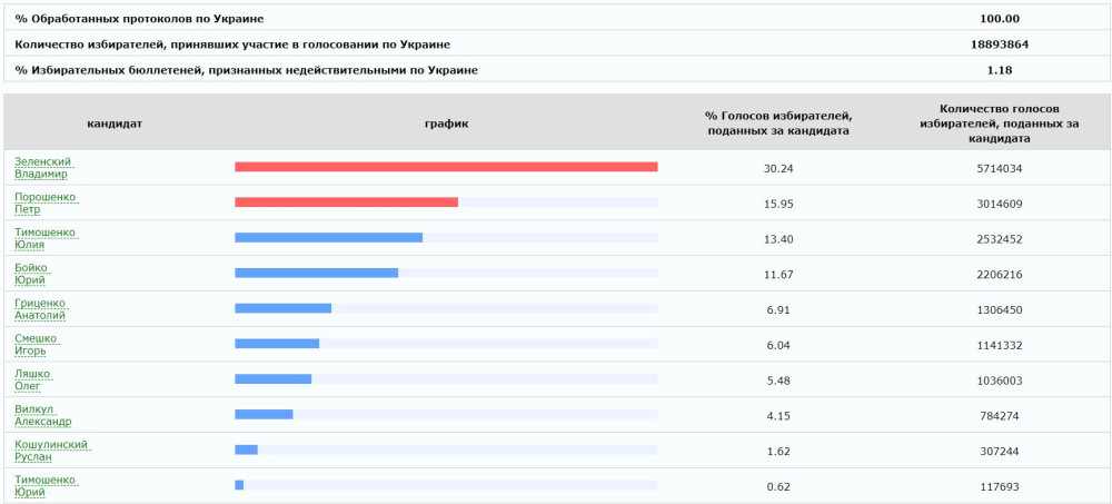 В итоге, по данным ЦИК, Владимир Зеленский набрал 30.24% или свыше 5,7 млн голосов. За Петра Порошенко проголосовали 15.95% или более 3 млн избирателей. Юлия Тимошенко набрала 13.40% или более 2,5 млн голосов, Юрий Бойко - 11,67% или более 2,2 млн.
