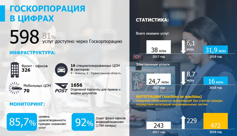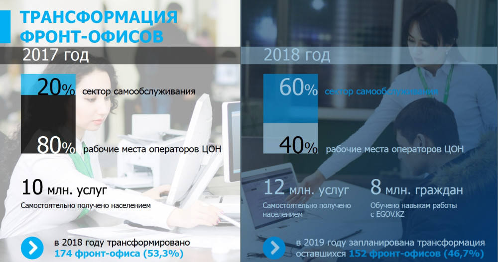 Для повышения уровня пользования услуг в электронном формате Правительство для граждан проводит полномасштабную трансформацию действующих фронт-офисов с внедрением нового принципа 60/40, где 40% - это операционный зал, где граждане получают услуги с помощью операторов, а 60% - это сектор самообслуживания "Connection Point". На сегодняшний день данный принцип уже работает в 174 фронт-офисах корпорации.