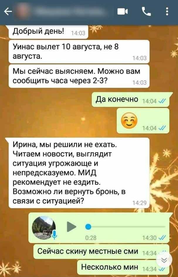 Он представил скрины переписки в мессенджере, по которым можно судить, что одни люди сняли бронь в доме отдыха, а другие интересовались, безопасно ли сейчас на Иссык-Куле.