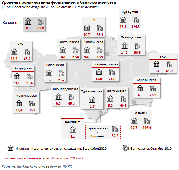 Хуже всех охвачены филиальной сетью Туркестанская область, где на 100 тысяч жителей приходится лишь 2,7 помещения, и Шымкент — 8,1 отделения. Что касается банкоматной сети, в Туркестанской области и Шымкенте в совокупности на 100 тысяч жителей приходится лишь 32,2 банкомата.