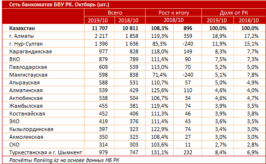 По количеству банкоматов на конец октября 2019 года также лидируют мегаполисы, Алматы и Нур-Султан. При этом в южной столице сеть увеличилась на 359 банкоматов, до 2,2 тысячи, в то время как в Нур-Султане, наоборот, сократилась на 240 устройств, до 1,4 тысячи.