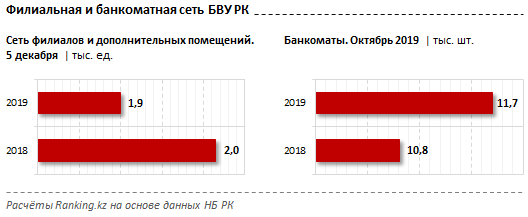 Количество филиалов и дополнительных помещений банков второго уровня на начало декабря 2019 года составило лишь 1,9 тысячи — на 2,4% меньше, чем в прошлом году.