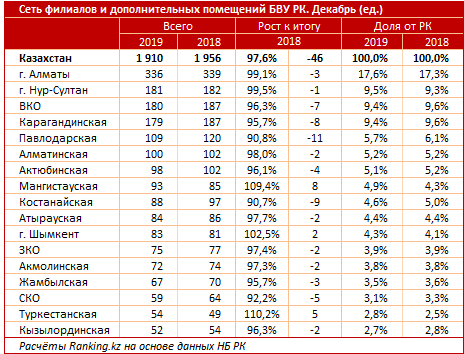 Меньше всего филиалов в Кызылординской (52), Туркестанской (54) и Северо-Казахстанской (59 банковских помещений) областях.