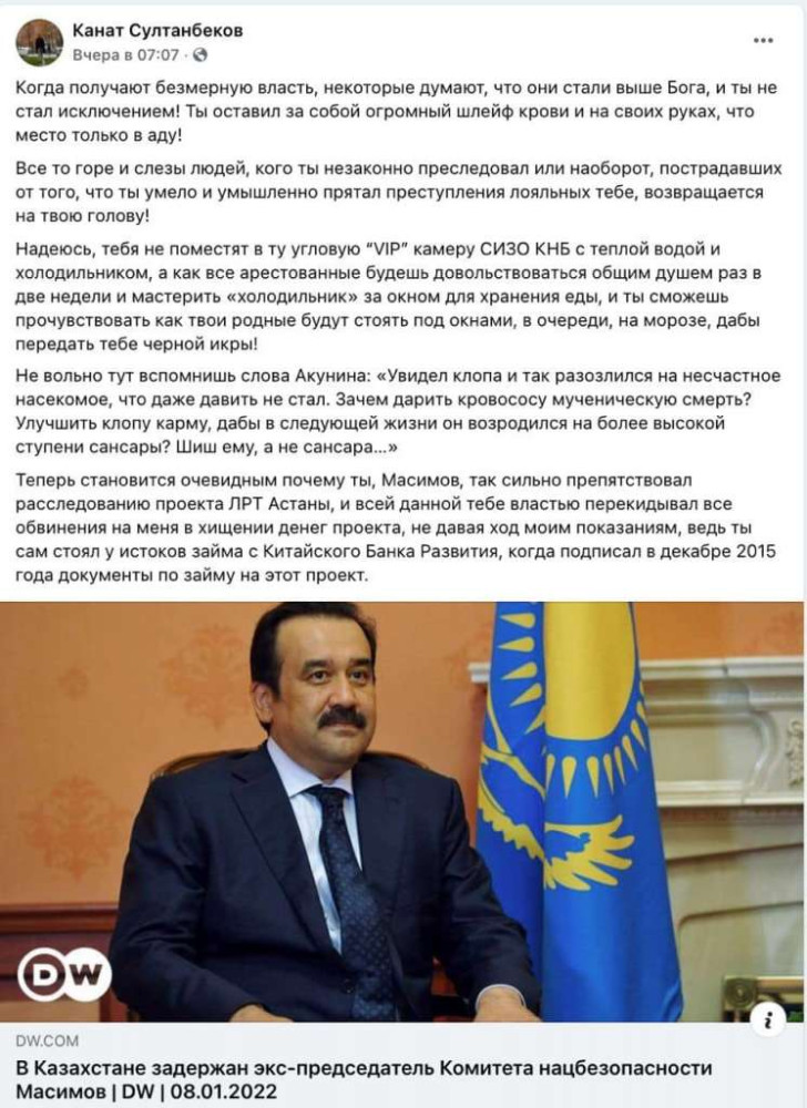 Бывший заместитель акима столицы Канат Султанбеков, объявленный в розыск, разместил на своей странице в Facebook пост о Кариме Масимове, передает корреспондент BaigeNews.kz. В тексте экс-чиновник обвиняет бывшего председателя КНБ в незаконном преследовании невиновных и сокрытии преступлений своих товарищей.