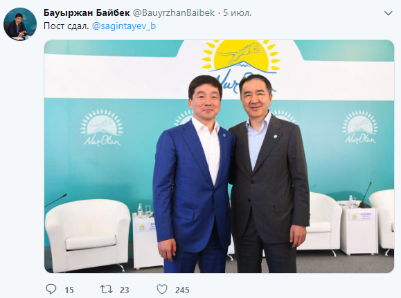 На его странице в Twitter вы можете найти исторический пост с новым градоначальником южной столицы Бакытжаном Сагинтаевым. "Пост сдал/Пост принял" - гласит подпись к фото, где два акима добродушно улыбаются на камеру.