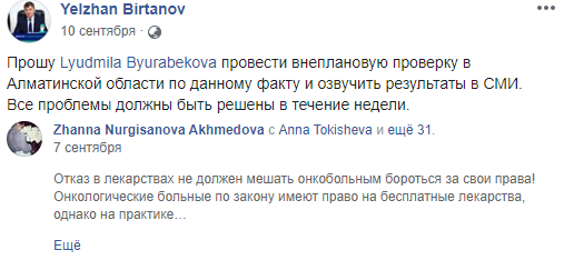 Стоит отметить, что глава Минздрава не только пишет посты, но и отвечает на комментарии под публикациями и обращения граждан. Прочитав в Facebook о нехватке лекарств для лечения онкобольных, он попросил главу комитета контроля и качества безопасности товаров и услуг Людмилу Бюрабекову в течение недели провести внеплановую проверку в Алматинской области и озвучить результаты в СМИ.